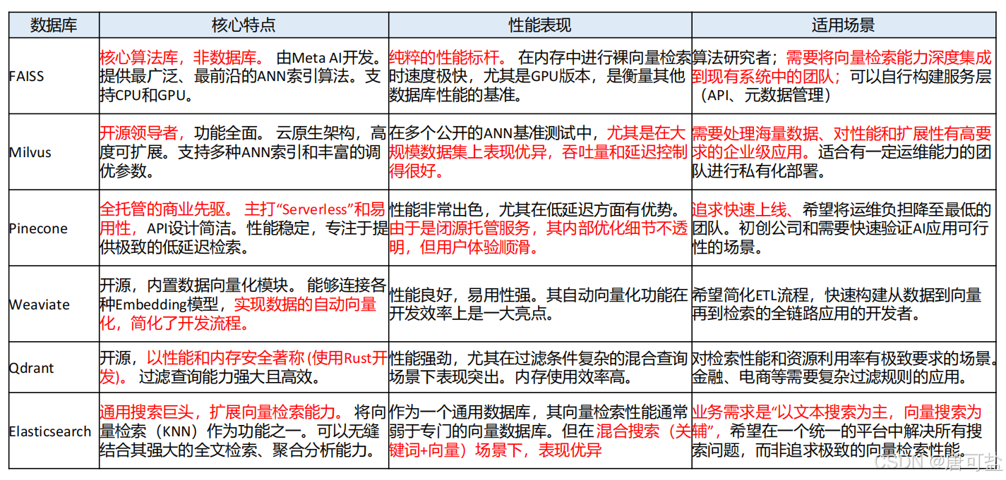 | 查询方式 | 精确匹配(SQL、键查询) | 近似最近邻搜索(ANN) |