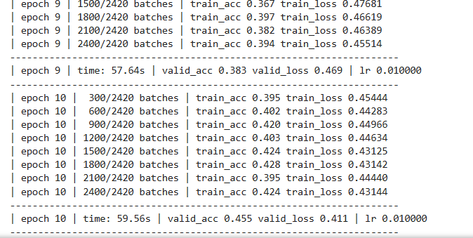optimizer = torch.optim.SGD(model.parameters(), lr=1e-2)for epoch in range(1, EPOCHS + 1):epoch_start_time = time.time()train(train_dataloader)val_acc, val_loss = evaluate(valid_dataloader)# 获取当前的学习率lr = optimizer.state_dict()['param_groups'][0]['lr']print('-' * 69)print('| epoch {:1d} | time: {:4.2f}s | ''valid_acc {:4.3f} valid_loss {:4.3f} | lr {:4.6f}'.format(epoch,time.time() - epoch_start_time,val_acc, val_loss, lr))print('-' * 69)