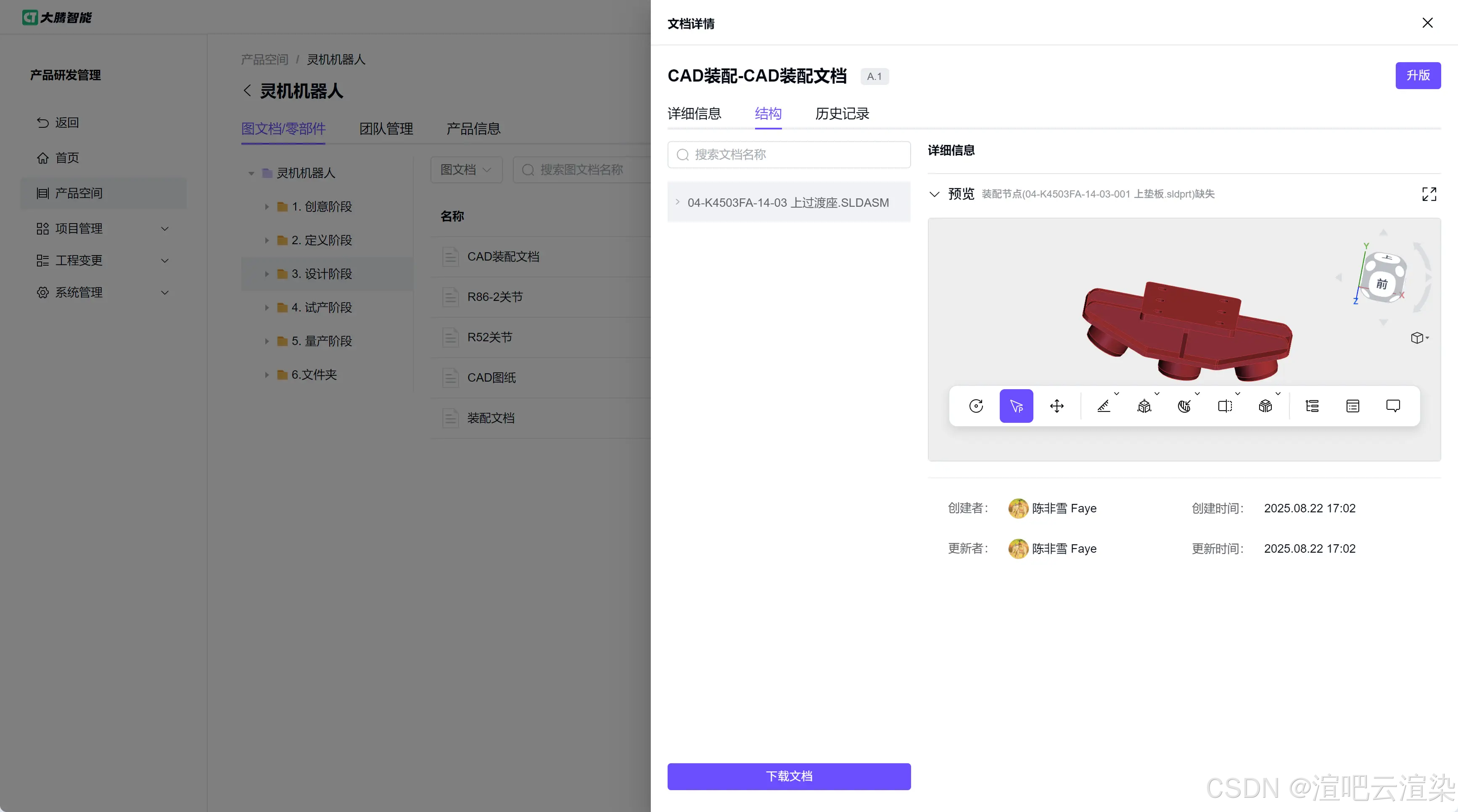 同时,大腾智能PDM具备完善的版本管理功能,每次对设计文档的修改都会自动生成新的版本,并记录修改人、修改时间与修改内容,确保所有成员获取的都是最新、最准确的设计数据,从根源上避免了因版本混乱导致的设计失误。