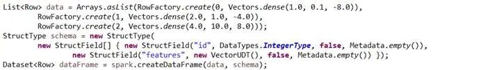 定义测试数据集合,设置数据集合的列名称以及数据类型,对数据集合执行初始化,生成spark数据类型的数据集合: