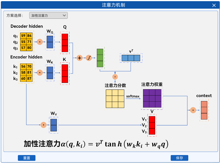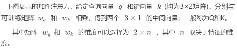 加性注意力是注意力机制的一种形式,它通过计算两个输入向量的相似度来确定权重。对于给定的查询向量 q、键向量 k,加性注意力分数的计算过程如下: