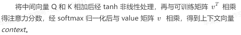 class AdditiveAttention(nn.Module):def __init__(self,hidden_dim):"""hidden_dim:"""super(AdditiveAttention,self).__init__()#线性变换矩阵 q kself.w_q=nn.Linear(hidden_dim,1)self.w_k=nn.Linear(hidden_dim,1)#权重向量v^Tself.v=nn.Linear(hidden_dim,1)def forward(self,q,k,v):Q=self.w_q(q) #[batch_size,q_num,hidden_dim]K=self.w_k(k) #[batch_size,k_num,hidden_dim]V=self.v(v)#2,加性计算sum_qk=Q+Ktanh_out=torch.tanh(sum_qk)# 3.与v^T相乘,计算注意力分数random_input = torch.randn(q.size(0),q.size(1), q.size(2))v_t=self.v(random_input)score= torch.bmm(tanh_out,v_t.transpose(1,2))# 4. softmax 归一化权重atten_weight=F.softmax(score,dim=-1)#维度归一化# 5. 权重与 V 加权求和,得到 contextcontext=torch.bmm(atten_weight,V)# [batch_size, q_num, hidden_dim]return context# 模拟输入(batch_size=1,简化维度)