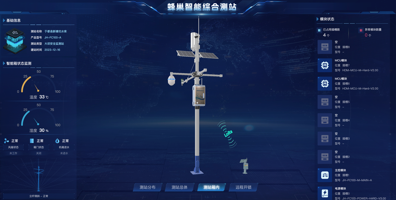 依托蜂巢式智能综合测站,平台能够实时采集水务现场的多维度数据,既包含环境参数(温度、湿度),也覆盖设施运行状态(风扇启停、箱门开关、机箱进水、立杆倾斜度),同时还可监测 MCU 模块、主控模块、电源模块等核心硬件的工况。