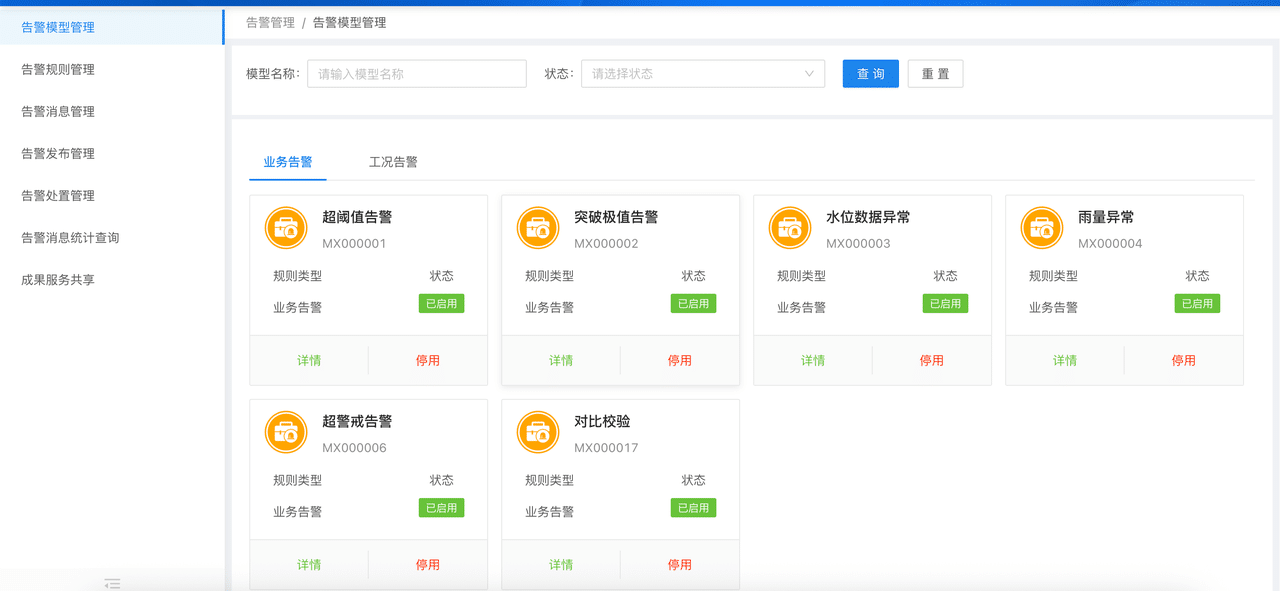 在告警模型管理模块中,系统可灵活配置多类型业务规则,包括超阈值告警、极值突破告警、水位/雨量异常告警、超警戒告警、对比校验告警等,并支持对模型的启用/停用及规则详情进行精细化管控。