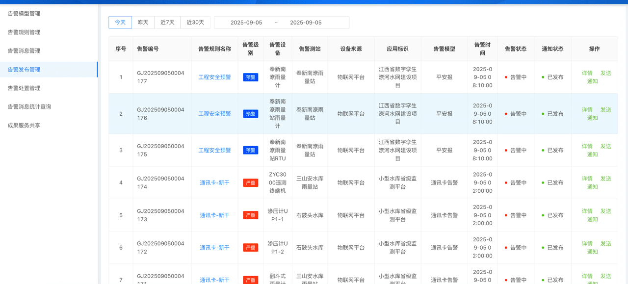 告警发布管理模块能够全要素记录并实时推送告警信息,涵盖告警编号、规则名称、级别、涉及设备/测站、时间、状态及通知情况,并支持“查看详情”“发送通知”等操作,串联起“告警触发—信息发布—人员响应”的闭环流程。