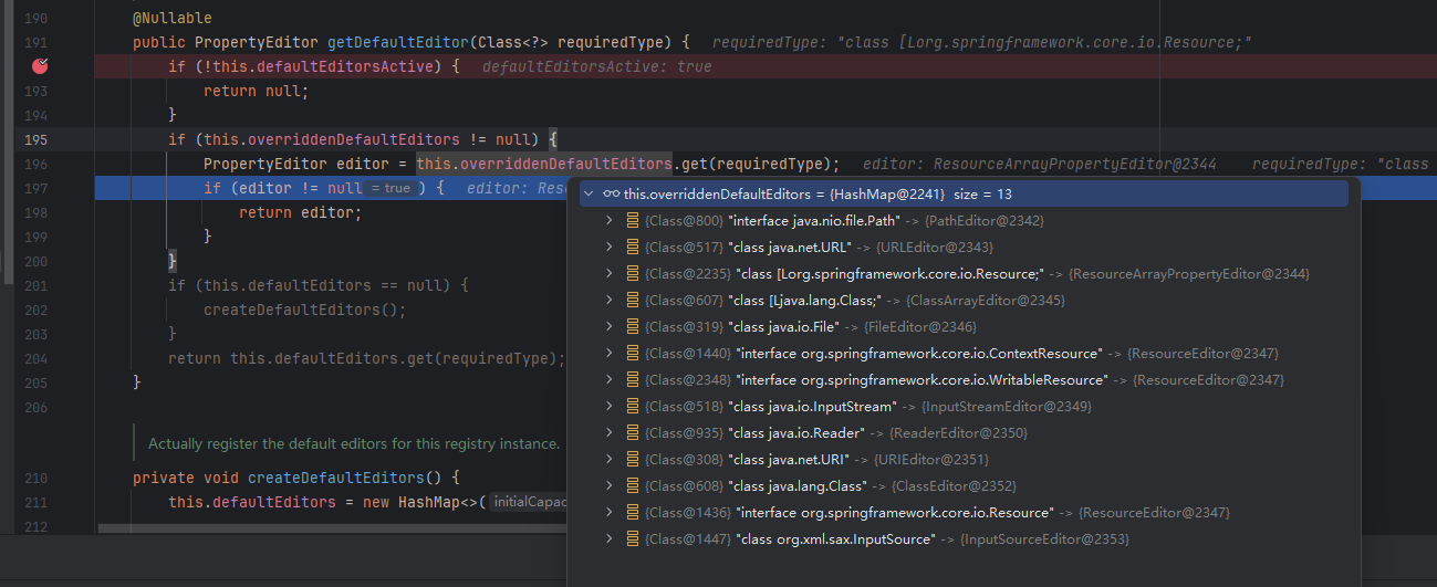 13.TypeConverterDelegate.findDefaultEditor(@Nullable Class<?> requiredType)方法的 editor = this.propertyEditorRegistry.getDefaultEditor(requiredType) 14.PropertyEditorRegistrySupport.getCustomEditor(@Nullable Class<?> requiredType)方法的