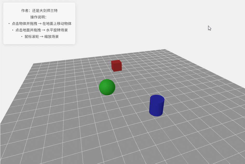 <template><div><div id="vue-three" style="width: 100vw; height: 100vh"></div><div class="info-panel"><p>作者:还是大剑师兰特</p><p>操作说明:</p><p>• 点击物体并拖拽 → 在地面上移动物体</p><p>• 点击地面并拖拽 → 水平旋转场景</p><p>• 鼠标滚轮 → 缩放场景</p></div></div>
