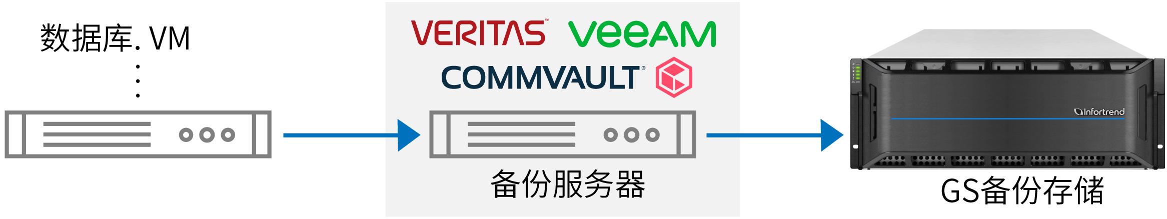 使用 EonStor GS 作为企业备份的目标端,完全兼容行业领先备份软件。