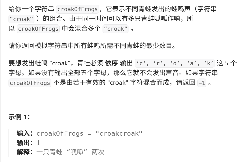 这道题给你一个字符串cro,里面包含多个青蛙的叫声,青蛙的叫声是“croak”,字符串cro可能包含多个青蛙的叫声,返回这个字符串最少需要几个青蛙完成叫。