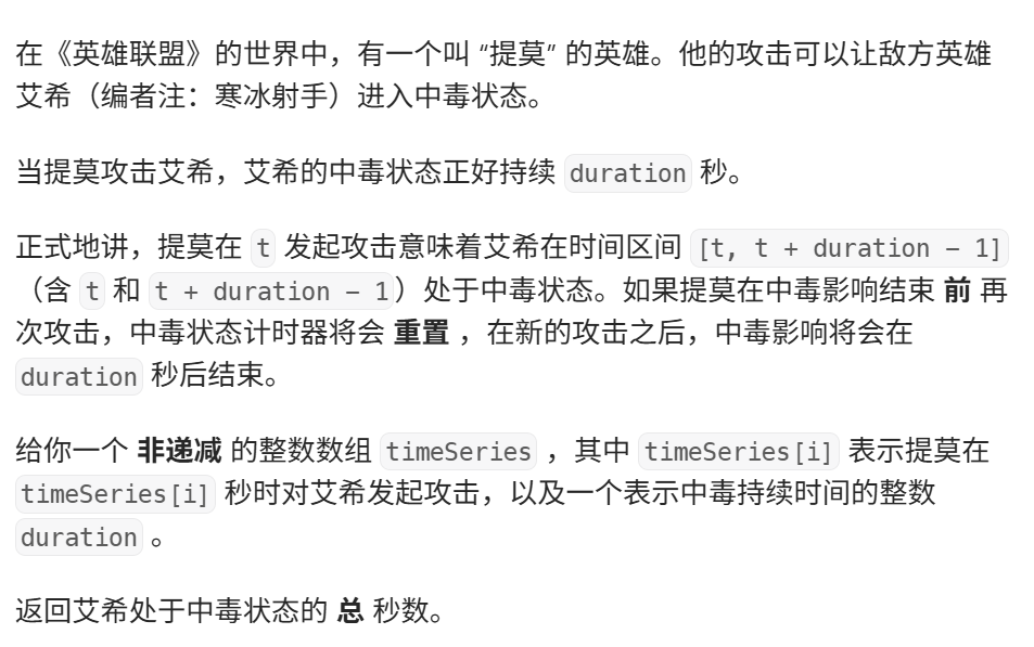class Solution {public int findPoisonedDuration(int[] timeSeries, int d) {int len = timeSeries.length;if(len == 1) {return d;}int sum = 0;for(int i = 1; i < len; i++) {int tmp = timeSeries[i] - timeSeries[i-1];if(tmp >= d) {sum += d;}else {sum += tmp;}}return sum + d;}
