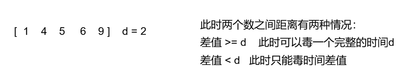 我们可以画个数组发现,两个数之间小于d,就会重新计时,此时前面的数只能执行两数之差秒,如果>=d,才会执行完整的时间d。