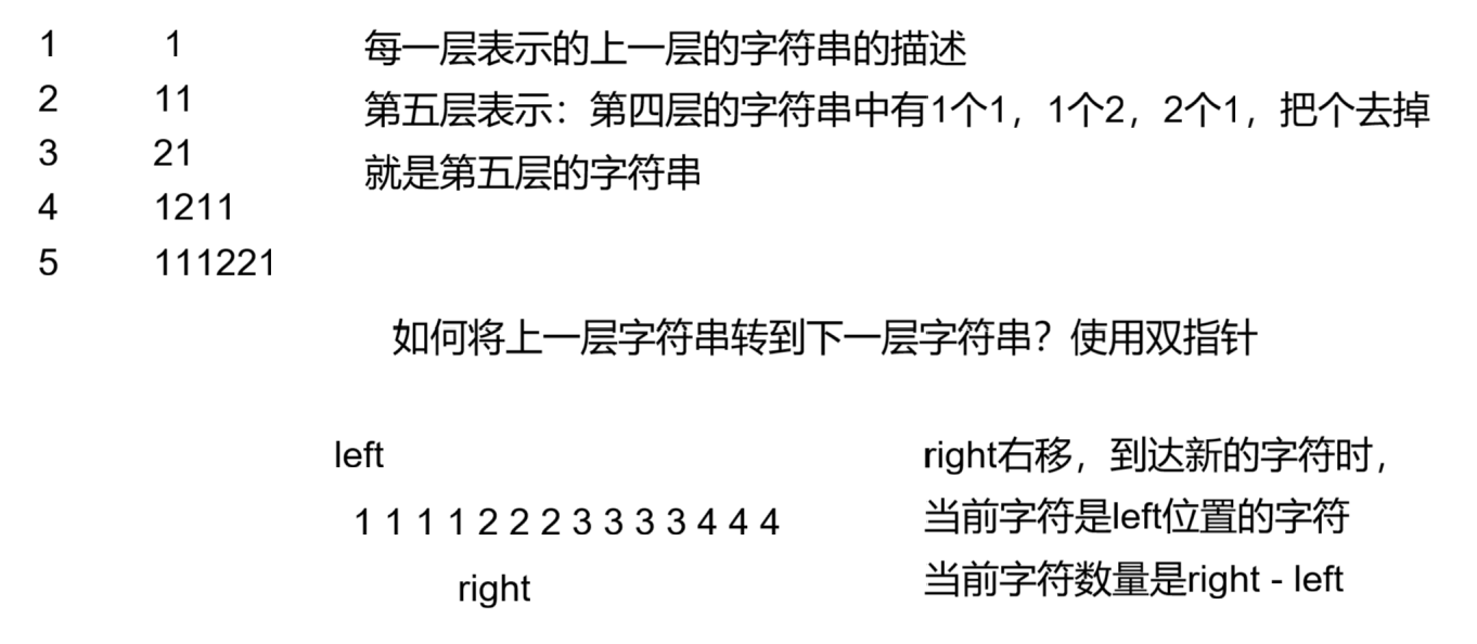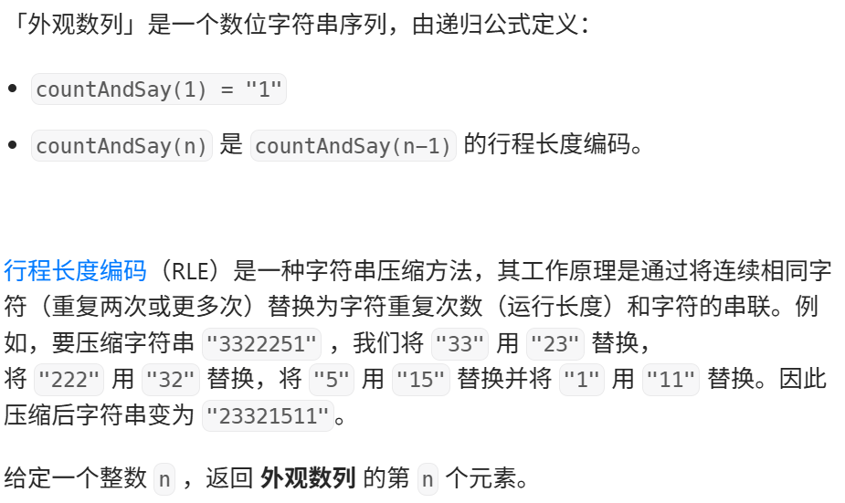 class Solution {public String countAndSay(int n) {if(n == 1) {return "1";}String start = "1";for(int j = 1 ; j < n; j++) {int left = 0;int right = 0;StringBuilder newStart = new StringBuilder();for(right = 0; right < start.length();) {while(right < start.length() && start.charAt(left) == start.charAt(right)) {right++;}newStart.append(Integer.toString(right-left));newStart.append(start.charAt(left));left = right;}start = newStart.toString();}return start;}