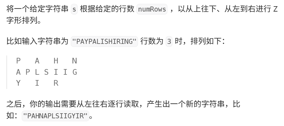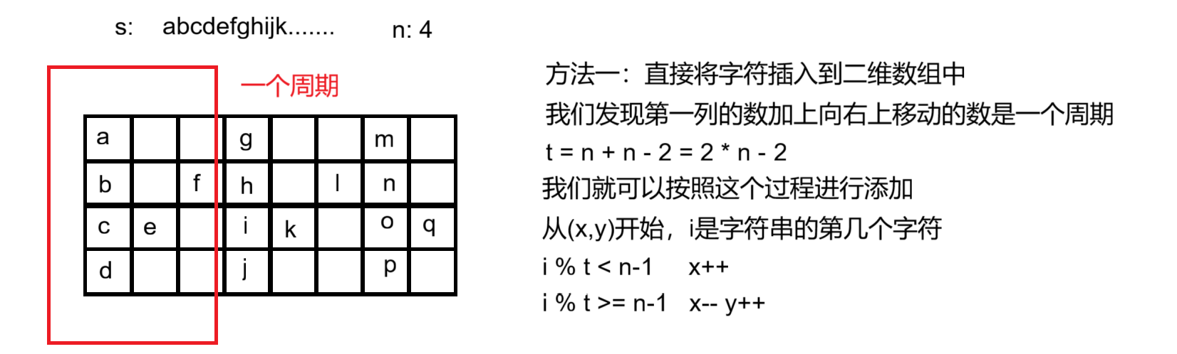 class Solution {public String convert(String s, int n) {int len = s.length();//当二维数组只有一行或者一列if (n == 1 || len <= n) {return s;}char[] c = s.toCharArray();char[][] arr = new char[n][len];int x = 0, y = 0;//周期:每个周期填2*n-2个字符int t = 2*n-2;for(int i = 0; i < len; i++) {arr[x][y] = c[i];if(i % t < n-1) {x++;//向下移动}else {//向右上移动x--;y++;}}StringBuilder ss = new StringBuilder();for (int k = 0; k < n; k++) {for (int j = 0; j < len; j++) {if (arr[k][j] != 0) {ss.append(arr[k][j]);}}}return ss.toString();}