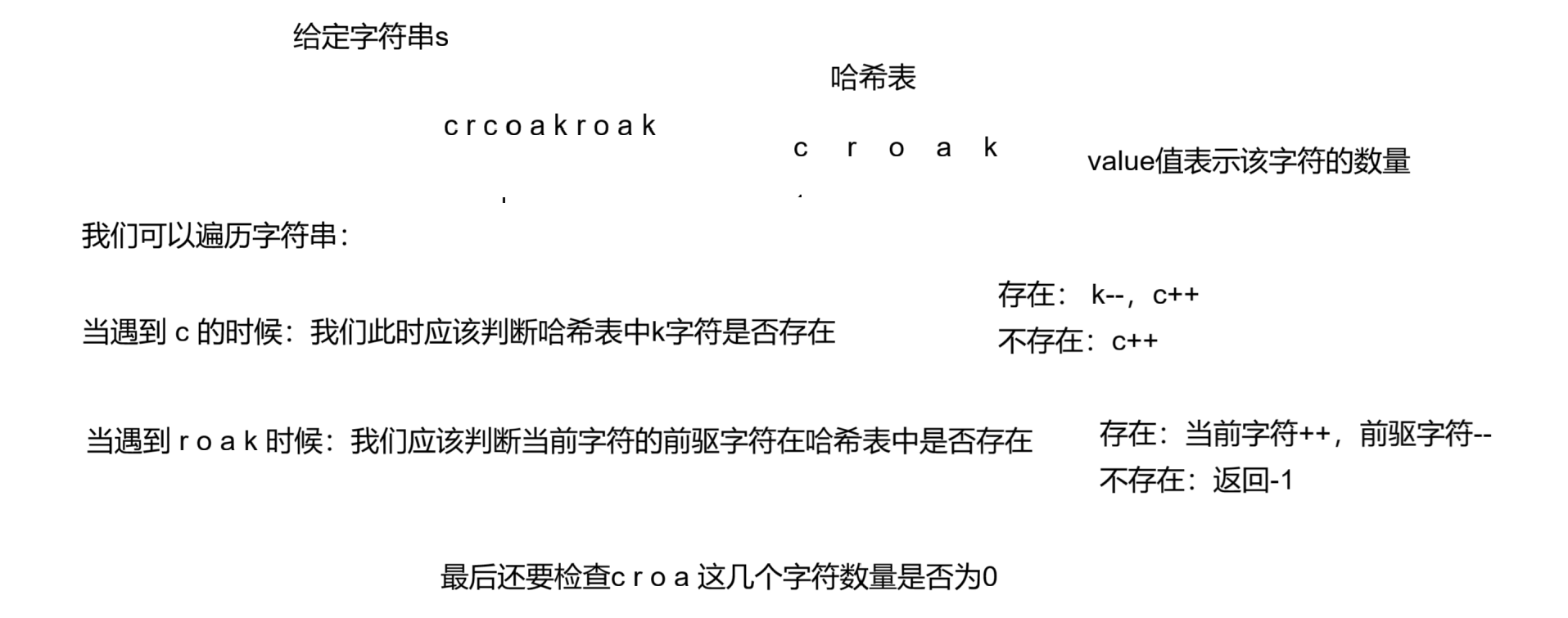 我们可以遍历字符串,设置一个哈希表来表示青蛙叫声的每个字符以及其对应的数量,然后遍历字符串,分情况讨论: