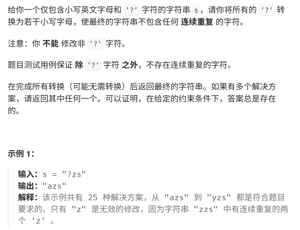 这道题给我们一个包含小写字母和'?’字符的字符串,让我们将字符串里面的?换成小写字母,并且保证字符串里面没有连续的字符。