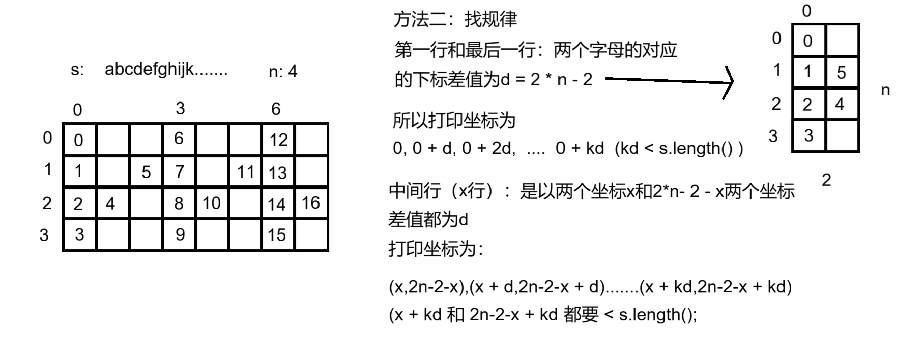 class Solution {public String convert(String s, int n) {int len = s.length();if(n == 1 || len <= n) {return s;}char[] c = s.toCharArray();StringBuilder ss = new StringBuilder();int d = 2 * n -2;for(int i = 0; i < n; i++) {if(i == 0 || i == n-1) {//打印第一行和最后一行for(int j = i; j < len; j += d) {ss.append(c[j]);}}else {//打印中间行int tmp = 2*n - 2 - i;for(int j = i; j < len; j += d) {ss.append(c[j]);if(tmp < len) {ss.append(c[tmp]);}tmp += d;}}}return ss.toString();}