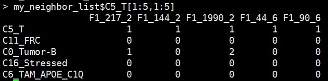 for(i in 1:length(my_neighbor_list)){df <- as.data.frame(t(my_neighbor_list[[i]]))df$center_cell_state <- names(my_neighbor_list)[i]cell_neighbor_df <- rbind(cell_neighbor_df, df)