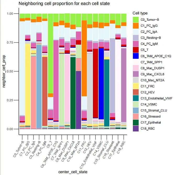 cell.prop$neighbor_cell_state <- factor(cell.prop$neighbor_cell_state, levels=c("C0_Tumor-B","C1_PC_IgG","C2_PC_IgA","C3_Resting-B","C4_PC_IgM","C5_T","C6_TAM_APOE_C1Q","C7_TAM_SPP1","C8_Mac_DUSP1","C9_Mac_CXCL8","C10_Mac_MT2A","C11_FRC","C12_HEV","C13_Endothelial_VWF","C14_VSMC","C15_Stromal_CLU","C16_Stressed","C17_Epithelial","C18_RBC")) # plot #