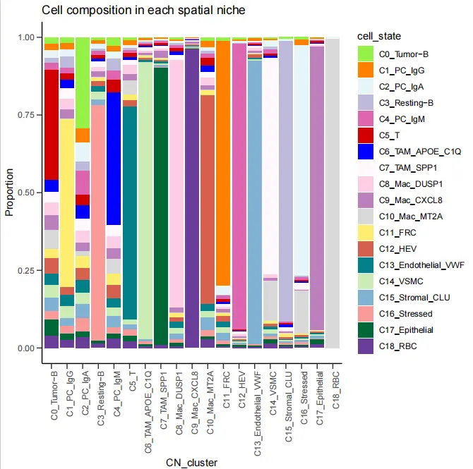 cell.prop$cell_state <- factor(cell.prop$cell_state, levels=c("C0_Tumor-B","C1_PC_IgG","C2_PC_IgA","C3_Resting-B","C4_PC_IgM","C5_T","C6_TAM_APOE_C1Q","C7_TAM_SPP1","C8_Mac_DUSP1","C9_Mac_CXCL8","C10_Mac_MT2A","C11_FRC","C12_HEV","C13_Endothelial_VWF","C14_VSMC","C15_Stromal_CLU","C16_Stressed","C17_Epithelial","C18_RBC"))ggplot(cell.prop,aes(CN_cluster,Proportion,fill=cell_state))+geom_bar(stat = "identity",position = "fill")+ggtitle("Cell composition in each spatial niche")+theme_bw()+scale_fill_manual(values=c("#96F148","#ff7f00","#e5f5f9","#bebada","#df65b0","#D10000","#0000FF","#fff7fb","#fccde5","#bc80bd","#d9d9d9","#ffed6f","#d6604d","#02818a","#ccecb5","#80b1d3","#fb9a99","#006837","#6a3d9a"))+theme_classic()+theme(axis.ticks.length = unit(0.2,'cm'))+ theme(axis.text.x = element_text(angle = 90,hjust = 1))guides(fill=guide_legend(title = NULL))