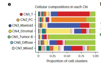 plot_ly(cell_neighbor_pca_coord, x = ~PC1, y = ~PC2, z = ~PC3, color = ~CN_cluster,colors=c("#ed2224","#fbb14d","#3B50A3","#eee817","#79c479","#55C7F3","#dad9d9"),alpha=0.7, sizes= c(50,50))# plot cell composition in each CN (Figure 2e) #