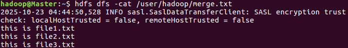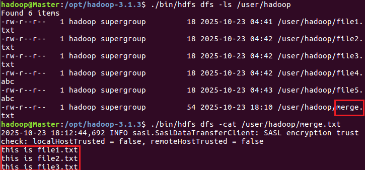 ./bin/hdfs dfs -cat /user/hadoop/merge.txt