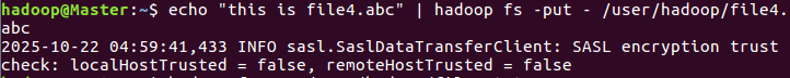 echo "this is file4.abc" | hadoop fs -put - /user/hadoop/file4.abc