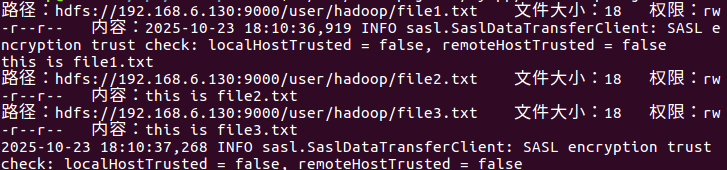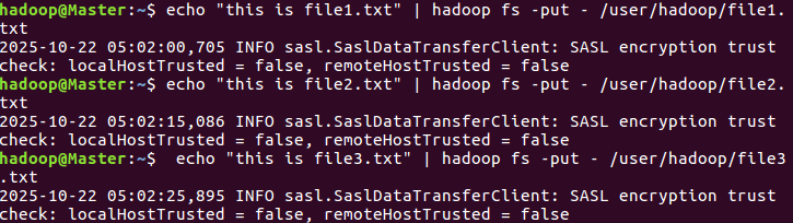 echo "this is file1.txt" | hadoop fs -put - /user/hadoop/file1.txtecho "this is file2.txt" | hadoop fs -put - /user/hadoop/file2.txtecho "this is file3.txt" | hadoop fs -put - /user/hadoop/file3.txt