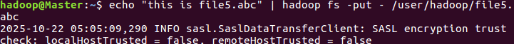 echo "this is file5.abc" | hadoop fs -put - /user/hadoop/file5.abc