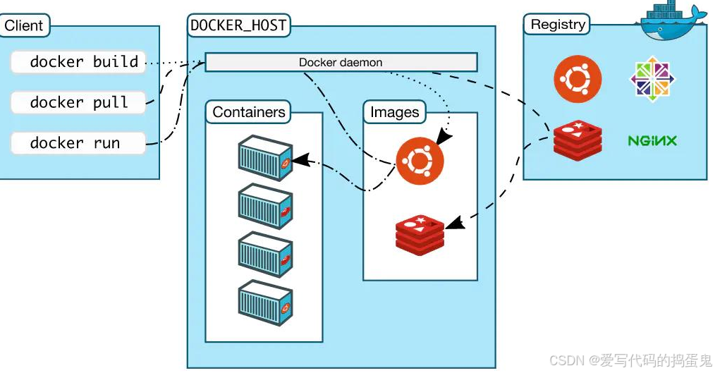 Docker客户端通过命令行或者其他工具使用DockerAPI与Docker的守护进程通信。