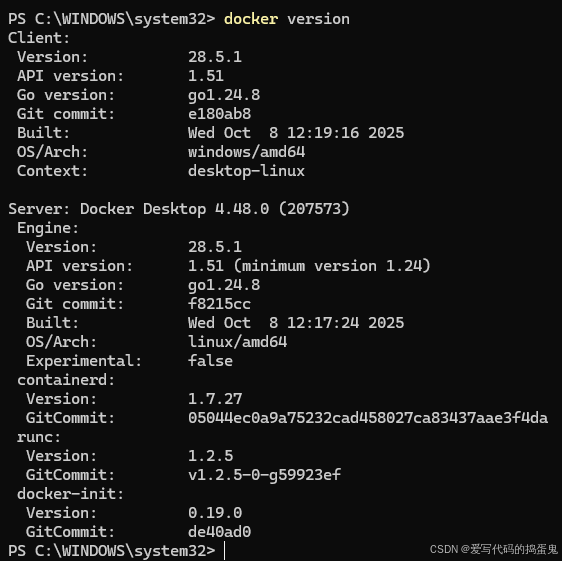 - 确认 Docker 安装成功, 在 PowerShell 中输入 docker version 命令确认 Client 和 Server 是否启动