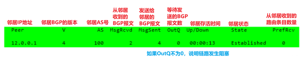 Established (连接已建立)︰表示收到keepalive报文,在Established状态,BGP 邻居关系已经建立,这时,BGP将和它的邻居们交换Update报文,同时复位保持计时器。