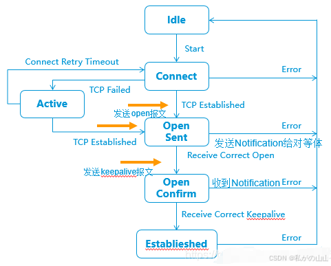 另外,在除ldle 状态以外的其它五个状态出现任何Error的时候,BGP状态机就会退回到ldle 状态。