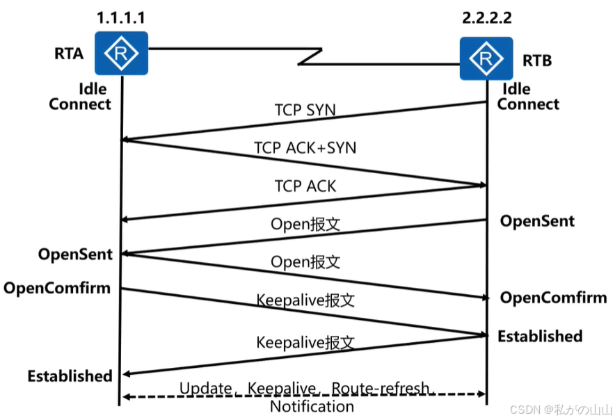 - keepalive报文作为open报文协商成功的标志,收到open报文,并且参数、能力协商一致,则发送keepalive报文给对方,对方收到后,转到establish状态。