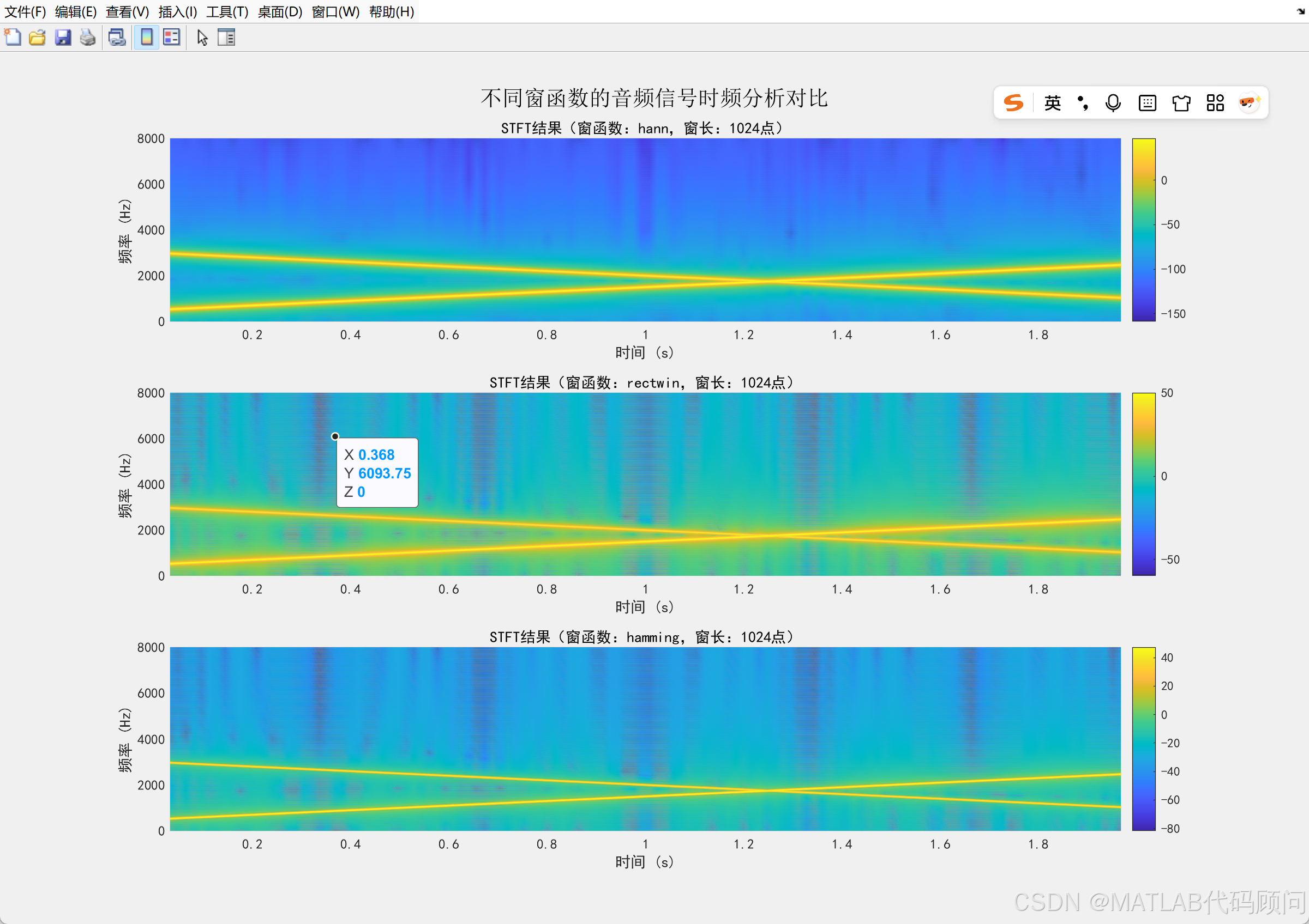 win_types = {'hann', 'rectwin', 'hamming'}; % 待对比的窗函数%% 3. 执行STFT并可视化