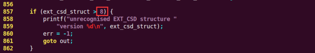 回到源码顶层目录,打开drivers/mmc/mmc.c,找到857行,修改对eMMC版本号的判断,将5改为8,