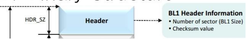 如下图所示,最上面的 16 个字节,number of sector(BL1 size) 也就是 BL1 的大小, Checksum Value 也就是累加和校验。就是说把整个 BL1 主体部分的内容累加和放到这里,然后实际计算下整个累加和,做对比,如果不对,就说明 BL1 是假的或错误的,不予执行。