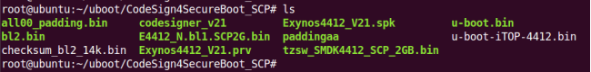 执行 cp checksum_bl2_14k.bin u-boot.bin ../CodeSign4SecureBoot_SCP/将u-boot.bin,checksum_bl2_14k.bin拷贝到CodeSign4SecureBoot_SCP文件夹,并进入此文件夹,cd ../CodeSign4SecureBoot_SCP/