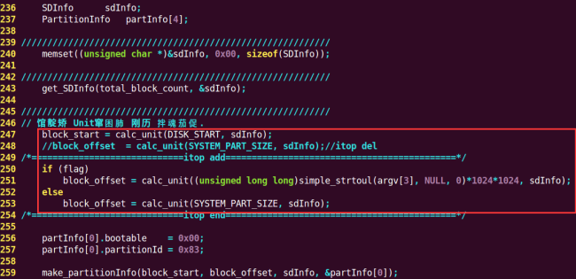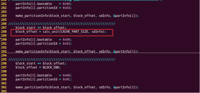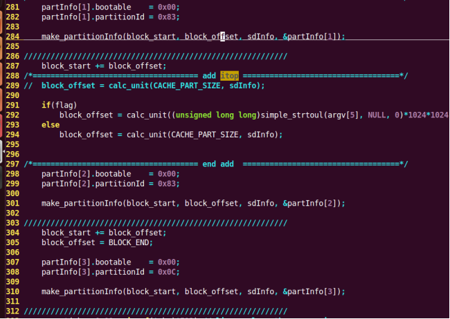 if(flag)block_offset = calc_unit((unsigned long long)simple_strtoul(argv[5], NULL, 0)*1024*1024, sdInfo);elseblock_offset = calc_unit(CACHE_PART_SIZE, sdInfo);改完后如下图: