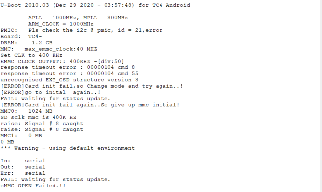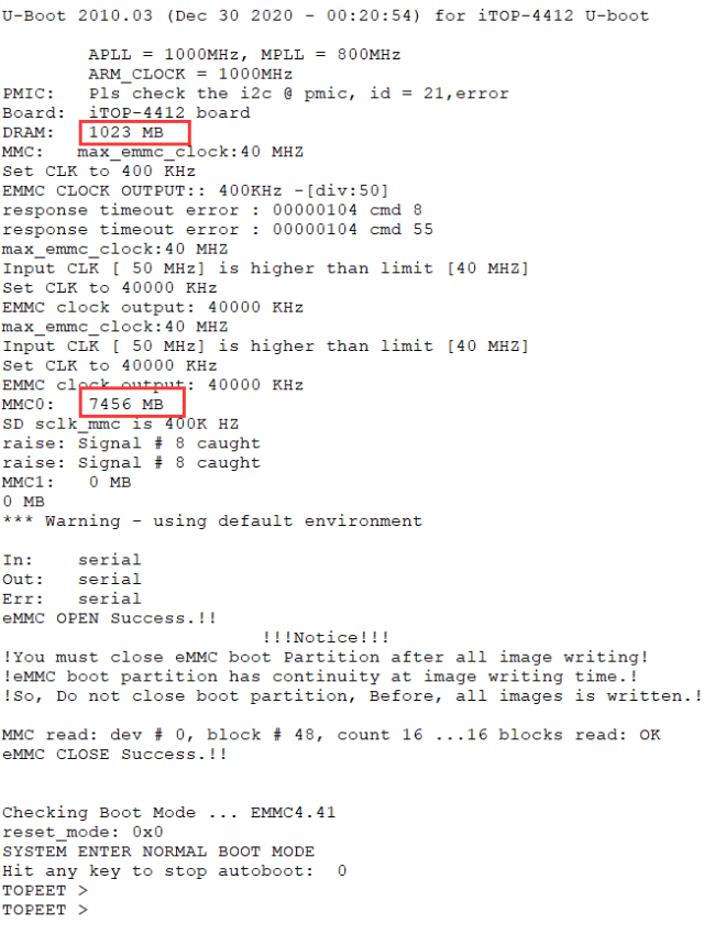 然后断电,拔掉TF卡,将开发板设置成eMMC启动,发现uboot命令行等待时间变成了5s,打印信息如下,内存和eMMC容量均识别正常: