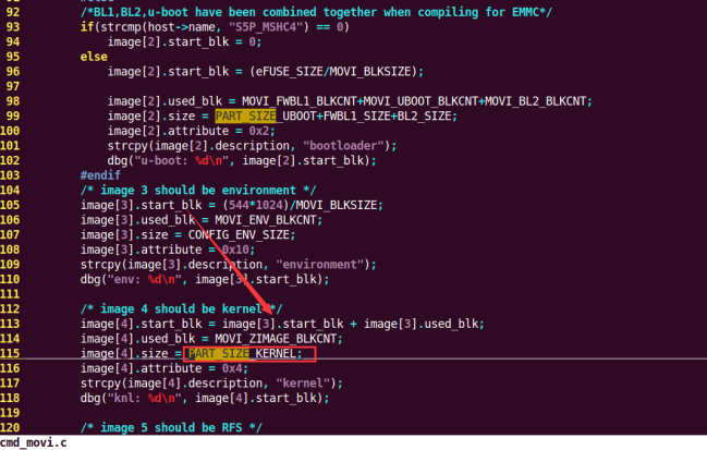 movi命令在common/cmd_movi内实现,可以看到movi命令将uboot的结束地址作为kernel的开始地址,读取地址,读取PART_SIZE_KERNEL个数据做为内核,如下图: