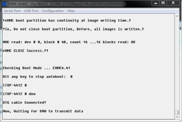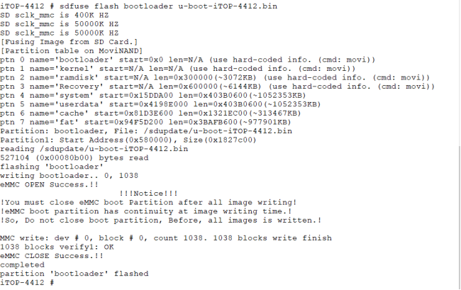 将TF卡插到开发板上,设置拨码开关TF启动,对eMMC进行分区(参考TF卡烧写章节这里不再重复赘述),然后执行sdfuse flash bootloader u-boot-iTOP-4412.bin 将自己生成的uboot镜像烧写到开发板eMMC,如下图: