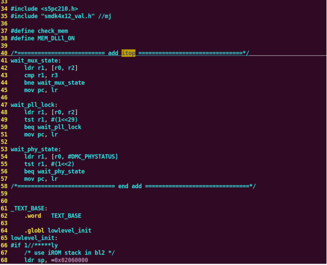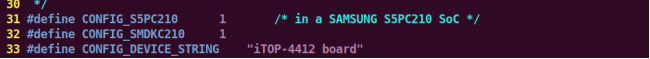 本小节修改的内容可参考uboot视频(ITOP-4412开发板视频教程\05-迅为电子uboot视频教程\10-uboot启动分析),回到源码顶层目录,打开cpu/arm_cortexa9/s5pc210/cpu_init.S,在31行添加如下内容: