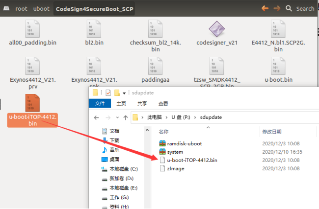 参考手册TF卡烧写章节,将光盘资料中的uboot烧写到TF卡上,将我们自己生成的u-boot-iTOP-4412.bin拷贝到sdupdate文件夹内,如下图: