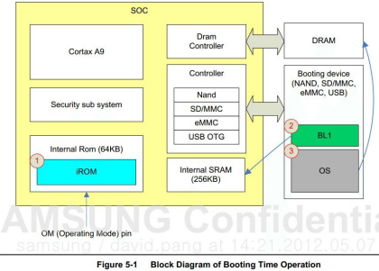 如上图所示,通过控制启动模式(OM),处理器上电以后,开始执行 IROM 中的代码, 这段代码是原厂三星固化在芯片中,是无法修改的。