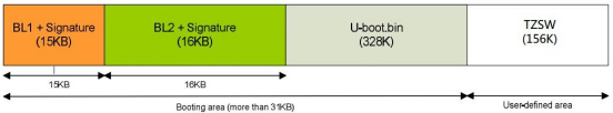 另外可以看到 Booting 分区有严格的规定,BL1 部分是 15KB,BL2 部分是 16KB,U- boot 是 328K。例如,Uboot 部分最终需要做补齐的,就是补齐到 328K。Uboot 不论怎么编译都是 328K。