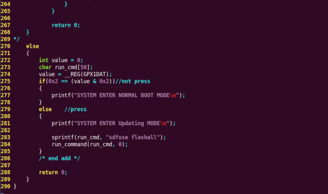 else{/* add by cym 20141211 GPX1_1 */int value = 0;char run_cmd[50];value = __REG(GPX1DAT);if(0x2 == (value & 0x2))//not press{printf("SYSTEM ENTER NORMAL BOOT MODE\n");}else //press{printf("SYSTEM ENTER Updating MODE\n");sprintf(run_cmd, "sdfuse flashall");run_command(run_cmd, 0);}/* end add */return 0;}添加完后如下图: