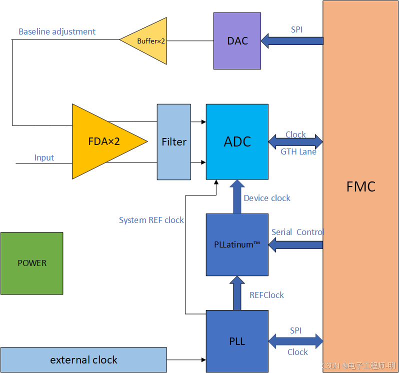 总体硬件架构设计,分别以ADC和FPGA为核心,设计整个单板的硬件架构