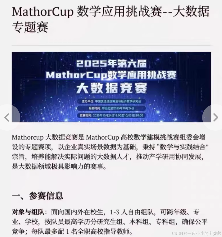 2025年MathorCup大数据建模竞赛(简称“妈妈杯”)是面向全国高校的高水平数模赛事,其AB题以技术深度高、应用场景实、学科交叉强的特点成为参赛者焦点: