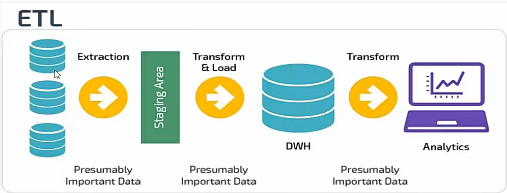 ETL流程是:抽取原始数据后,在数仓外部的专用ETL工具中完成转换,再将数据加载到数仓中。其中转换过程依赖工具的计算能力,数仓主要承担存储和查询角色;
