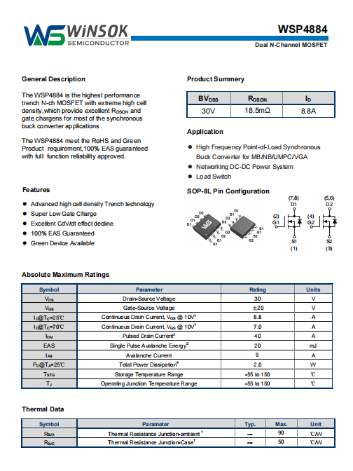 智能座舱PMIC需在方向盘、仪表、HUD等8 mm×8 mm模块内,输出3.3 V/5 A,并承受24 V Load Dump,对功率器件提出“30 V耐压、18.5 mΩ低阻、SOP-8L小封装”三维硬指标。微硕WINSOK WSP4884(30 V/8.8 A/18.5 mΩ,SOP-8L)凭借双N集成、6 nC超低栅极电荷与20 mJ雪崩能量,成为座舱PMIC“微型稳压核”首选。